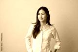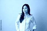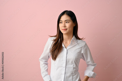 Confident Asian woman in a white shirt looking away from camera, a pink studio background.