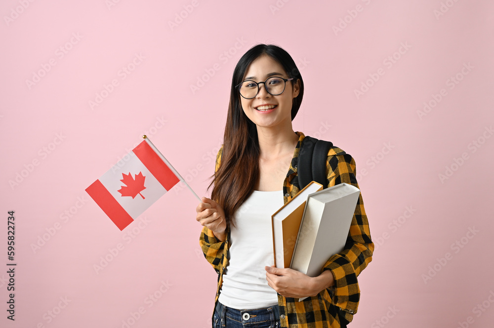 Smiling Asian female college student holding a flag of Canada against a pink isolated background