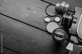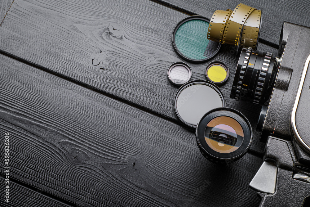 Vintage amateur movie camera, filmstrip, lenses and filters on a black wooden desktop. Copy space.