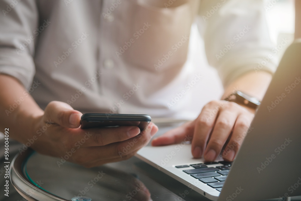 Man holding mobile smartphone and laptop digital technology internet online, social networking , marketing online concept.