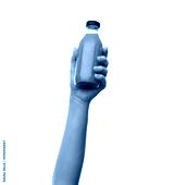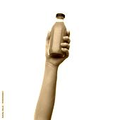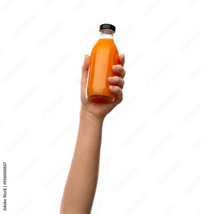 healthy lifestyle and detox concept - hand holding glass bottle of orange or carrot juice isolated on white background