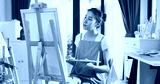 Happy youth Asia Female wear apron holding palette color use brush painting on canvas create artwork in cozy workshop at home. Contemporary Painter Abstract Modern Art, Creativity and people concept.