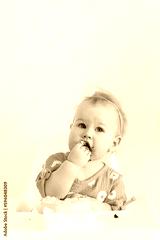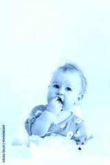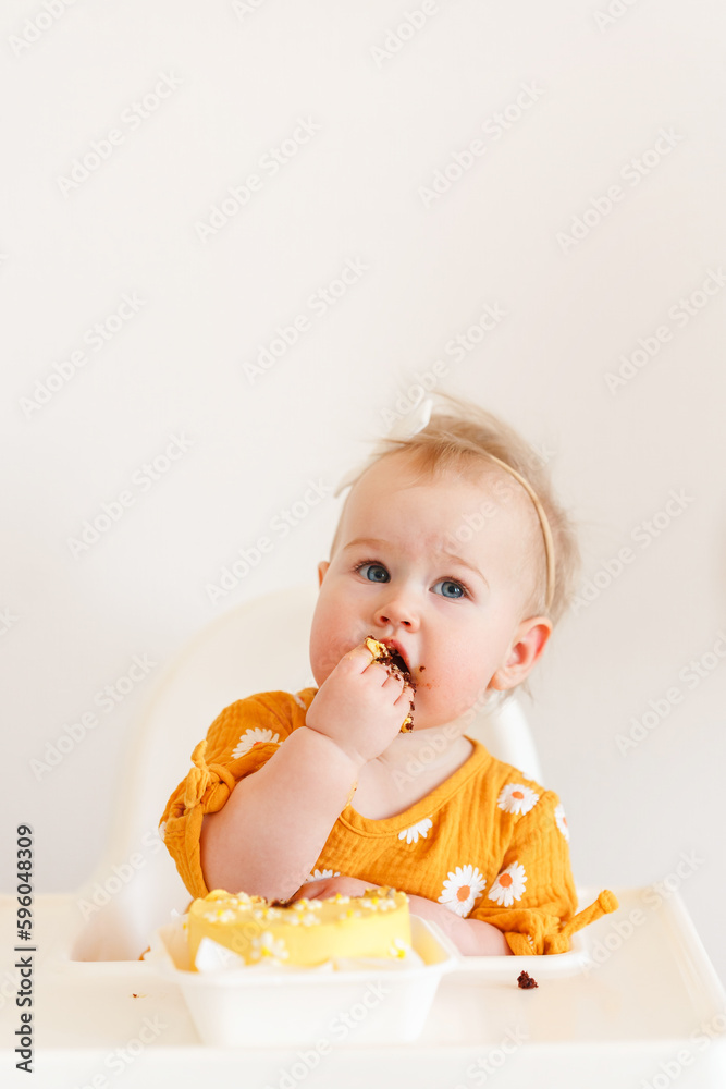 A charming little one-year-old baby girl in an elegant dress with daisies is sitting on a high chair and eating a cake. Celebrate one year of birth.