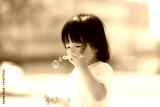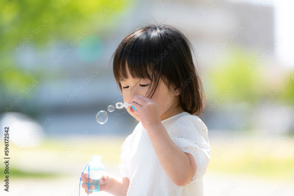新緑の初夏の公園でシャボン玉をして遊ぶ小さな女の子