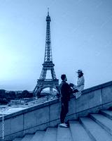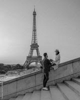 Young couple by Eiffel tower at Sunrise, Paris Eifel tower Sunrise man woman in love, valentine