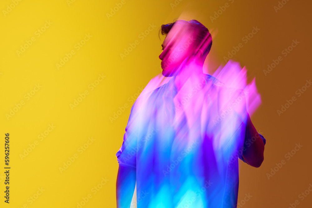 Young stylish man standing against gradient yellow background with mixed neon multicolored lights effect. Futurism. Concept of modern photography, art, cyberpunk, techno, creativity, beauty