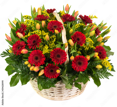 Bouquet of red gerbera and tulip flowers in basket isolated on white background