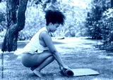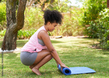 Young multi-ethnic woman unrolls her yoga mat on the lawn in park garden