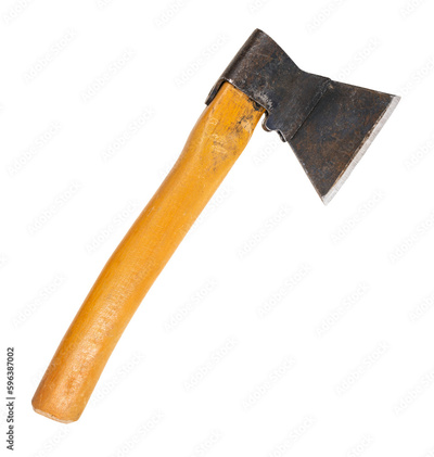 small tourist hatchet on wooden handle with sharp edge of blade isolated on white background