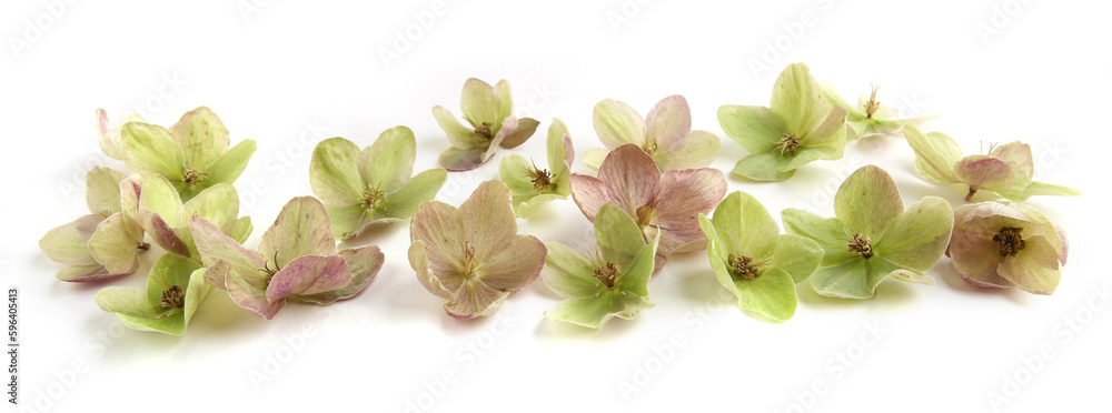 Snow rose Hellebore isolated on white background. Evergreen flower Hellebore, Christmas rose, blooms in winter outdoors when the weather is cold and snow.