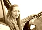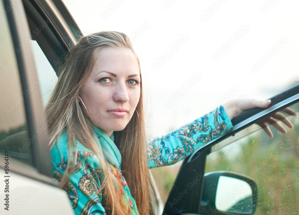 young woman is sitting in the car