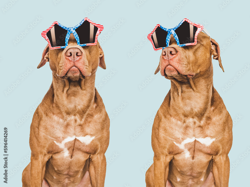 Two brown dogs and sunglasses with American flag pattern. Photo collage. Travel preparation and planning. Close-up. Studio shot. Concept of care, education, obedience training and raising pets