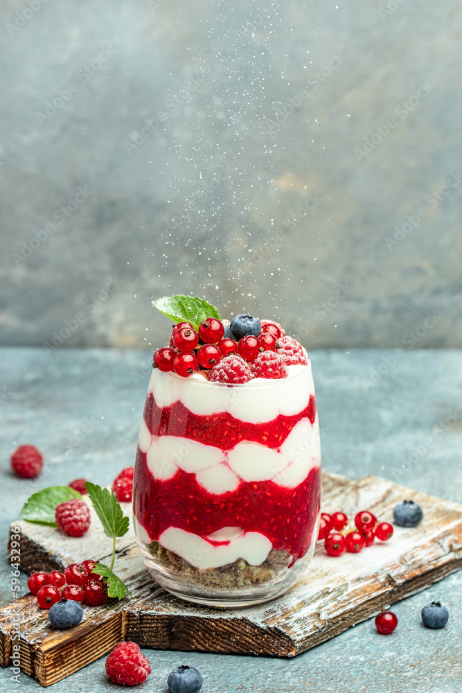 yogurt granola parfait with blueberry and raspberry on a light background. vertical image. top view. place for text