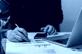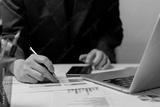 Businessperson reviewing documents with pen, analyzing data on graph report statistic and chart finance, budget, investment, accountant, diagram on desk.