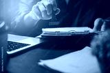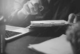 Man stamping approval of work finance banking or investment marketing documents on desk.