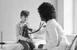 African American pediatrician listening to heartbeat of boy patient with stethoscope. Female doctor, general practitioner examining cute boy in medical clinic. Treatment and healthcare concept