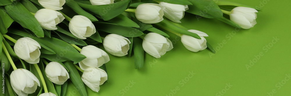 Beautiful bouquet of white tulip flowers with card on green background, space for text