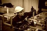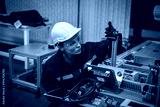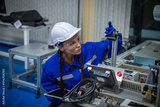 Engineer factory industry wearing safety uniform work and checking system of the welding robots for welding steel electrical by control system robot automate for industry manufacture concept.