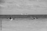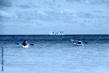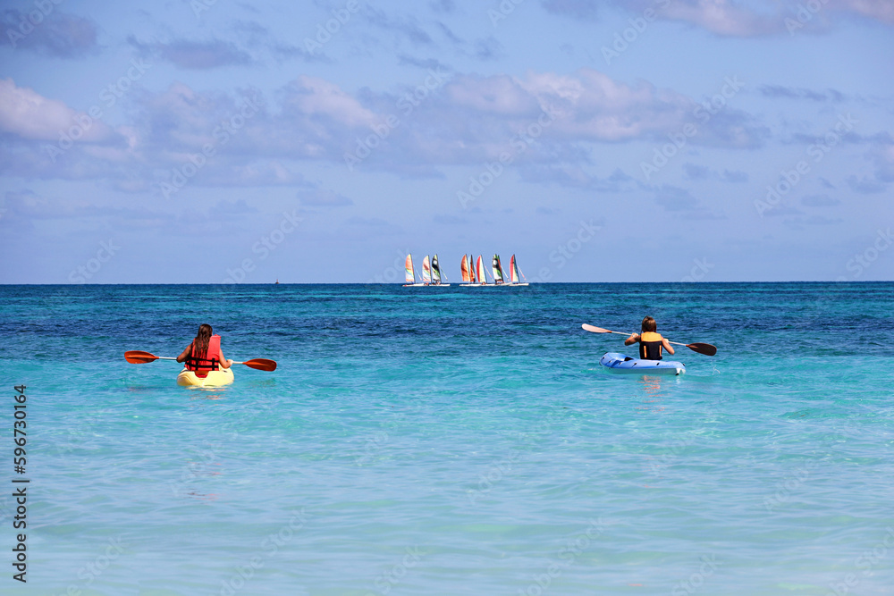Kayaking in the sea, two girls wearing life vests sitting with paddlers in canoes on sailboats background. Travel and water sports concept