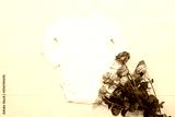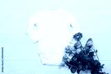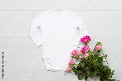 White mockup newborn shirt. Wooden background, pink roses, happy birthday. Blank template jumpsuit bodysuit front top view. Baby clothing. Bouquet of flowers
