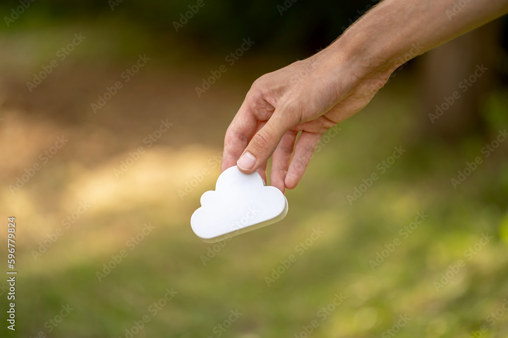 Man holding a simple white cloud symbol in hand, cloud computing and storage services sign held in hand, object isolated, blurred background, copy space. Cloud technology, AI computation, storing data