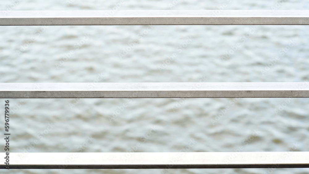 Metal railing barrier bars and moving water background, river bank, sea, ship boat side simple minimal backdrop, water movement, nobody, no people. Relaxing calm serene scene, bright static background