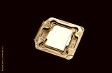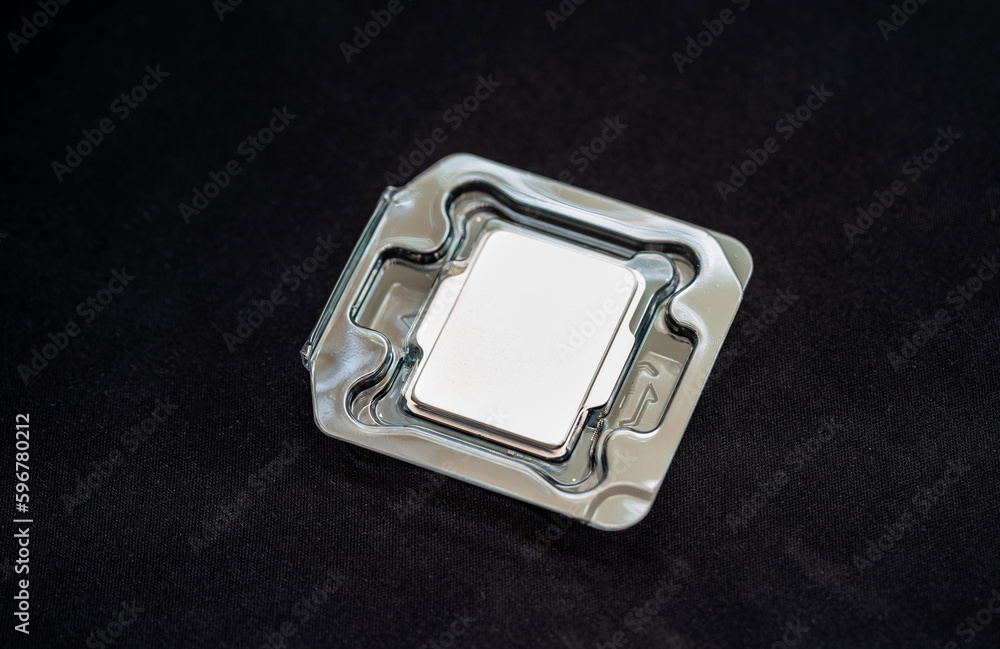 One single generic modern high end CPU, brand new processor packaged in a simple transparent plastic box container, production line, premium quality PC parts, components concept, detail, closeup