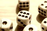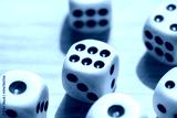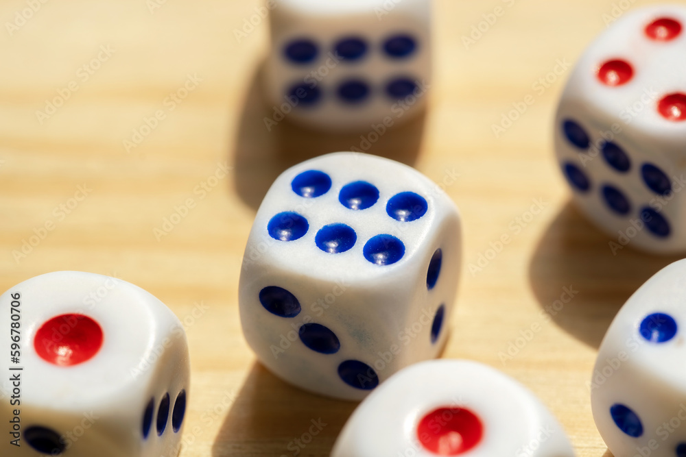 Set of a few simple game dice, central one showing number six. Chances in gaming, board games, leisure, gambling, random numbers draw abstract concept, nobody. Objects macro, detail. Luck, victory