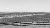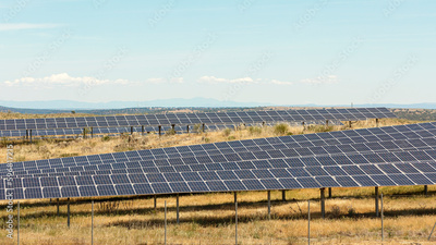 Photovoltaic solar panel farm with landscape background , green clean energy concept. Panoramic view of a modern solar farm of photovoltaic panels on a plot