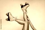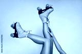 Close up photo of woman's body part. Legs wearing glamour silver glitter roller skates with shoelaces on pink vivid background