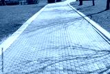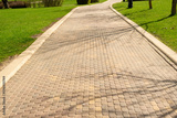 Brick path or sidewalk with perspective going into the distance. Long paved brick footpath outside with grass.