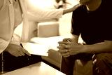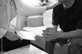 Professional psychologist conduct a consulting with sad patient in clinic..