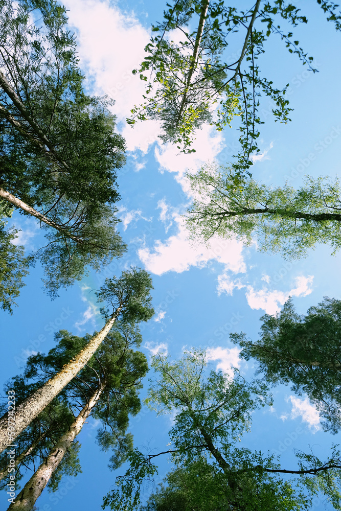 crown pine trees against blue sky natural abstract background. Forest pine trunks and branches, tops of trees bottom view. Beautiful nature landscape. template for design