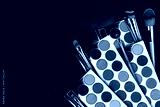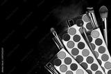 Bright eye shadow, blush brushes, explosion of multicolored powder dust on black background. Highly vibrant color-pressed pigment palettes for make-up. Abstract background for cosmetic concept.