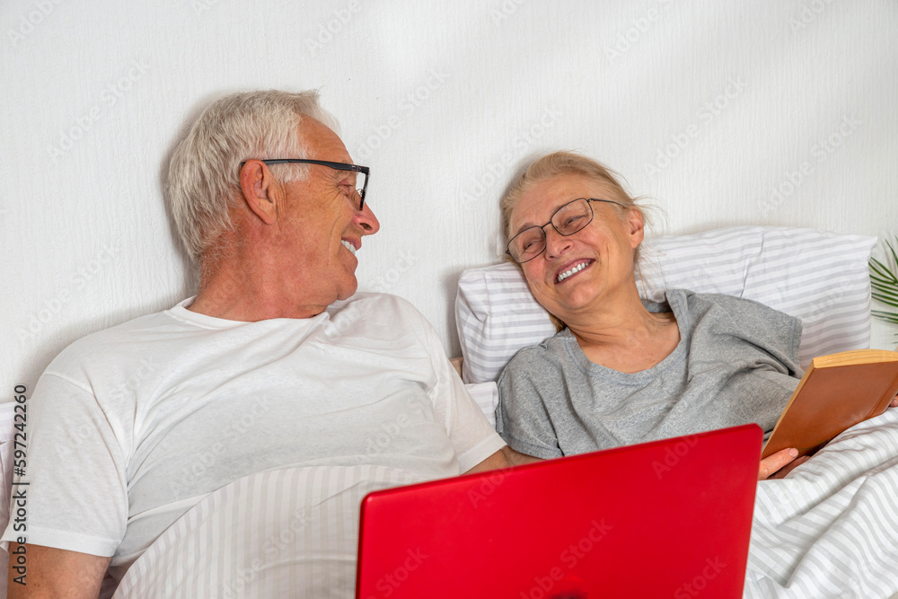 Senior couple spending leisure time in bed. A woman reads a book, a man works with a laptop while lying in the bedroom