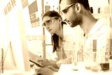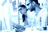 Two Young laboratory scientists look at the display and working with Futuristic Holographic Interface, showing medical Data in augmented reality from artificial intelligence AI.