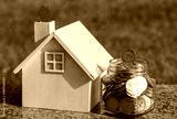 A miniature wooden house and a glass jar filled with Kazakhstani coins in denominations of 100 and 200 tenge