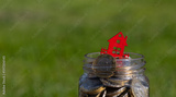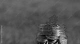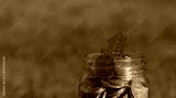 A miniature wooden house and a glass jar filled with Kazakhstani coins in denominations of 100 and 200 tenge