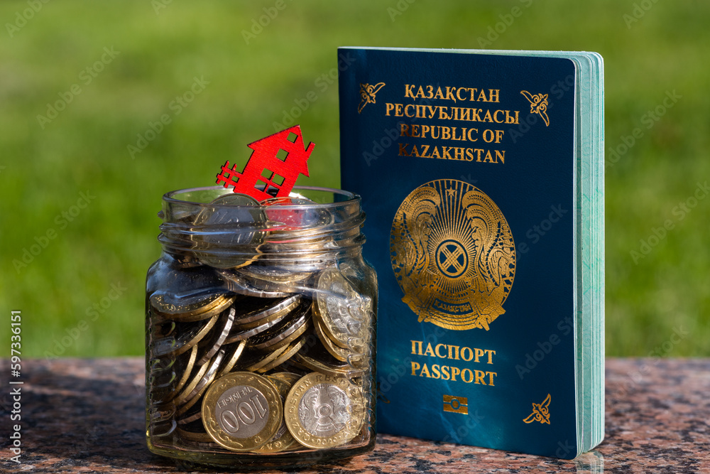 A miniature wooden house and a glass jar filled with Kazakhstani coins in denominations of 100 and 200 tenge