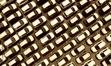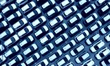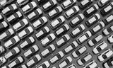Aerial view of new cars stock at factory parking lot. Above view cars parked in a row. Automotive industry. Logistics business. Import or export new cars at warehouse. Big parking lot at port terminal