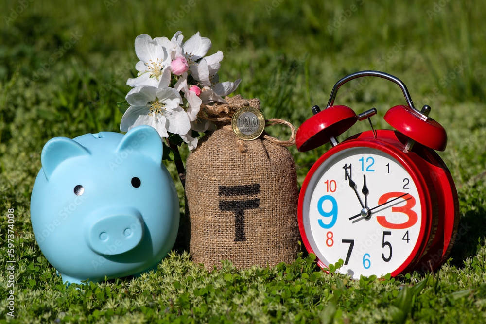 Bag for money with the symbol of the Kazakh currency - tenge and a branch of a blossoming apple tree