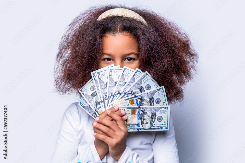 Portrait smile little african american girl, dollar banknotes. Children girl afro dollars 100. Smiling multiracial teenage kid girl holding hundreds of dollar money banknotes isolated background
