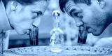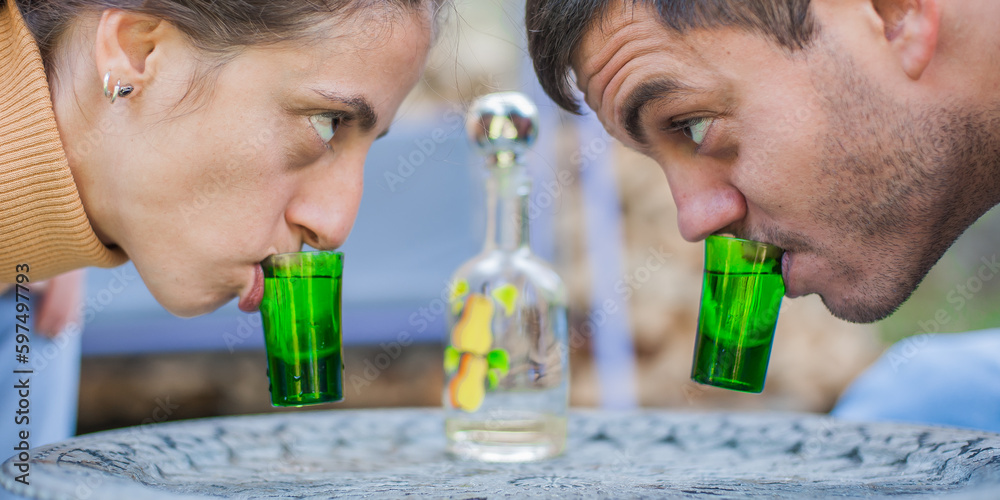 Cheers. Very drunk couple, a boy and a girl, chug shot drink from small glasses. Express drinking and fast get drunk concept