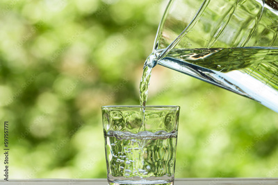 Purified fresh drinking water being poured from the jug into the crystal glass with the nature background. Close up view of crystal glass pure water in a natural environment. Crystal jug with water