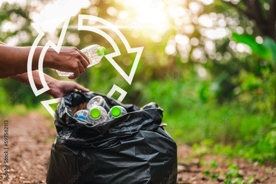 recycling, eco, save, plastic bottle, plastic, environmental, reuse, ecological, plastic bag, trash. plastic bottles let down to trash or recycle bag. to save environmental reuse plastic and bottle.