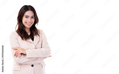 Portrait smiling young business woman crossed arms Happy girl posing with crossed arms and looking at camera over white background and copy space Confident female get happy and feel relax Successful