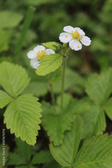 Close-up of wild strawberry plants in bloom on springtime. Fragaria vesca flowers on selective focus