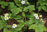 Wild strawberry plants in bloom on springtime. Fragaria vesca flowers on selective focus