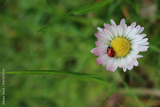 Ladybug on common daisy. Coccinella punctata on Bellis perennis