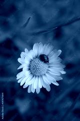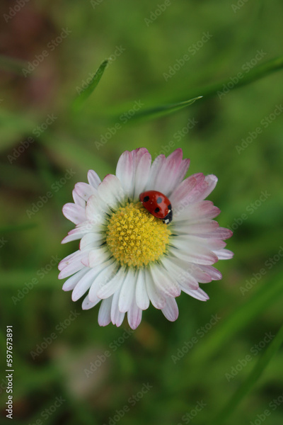 Ladybug on common daisy. Coccinella punctata on Bellis perennis
